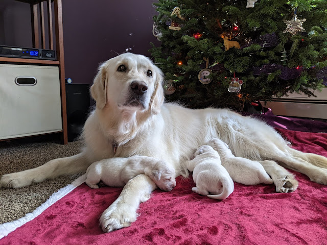 The pups arrived on the afternoon of December 22nd! I delivered the first alone, but was surrounded by family for the other two. Chloe was front and center the entire time, not leaving Violet's side. Two boys and a girl!